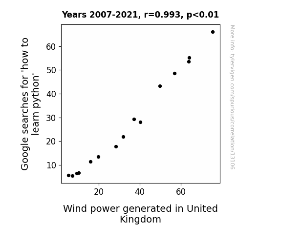 This means 98.5% of the change in the one variable (i.e., Wind power generated in United Kingdom) is predictable based on the change in the other (i.e., Google searches for 'how to learn python') over the 15 years from 2007 through 2021.