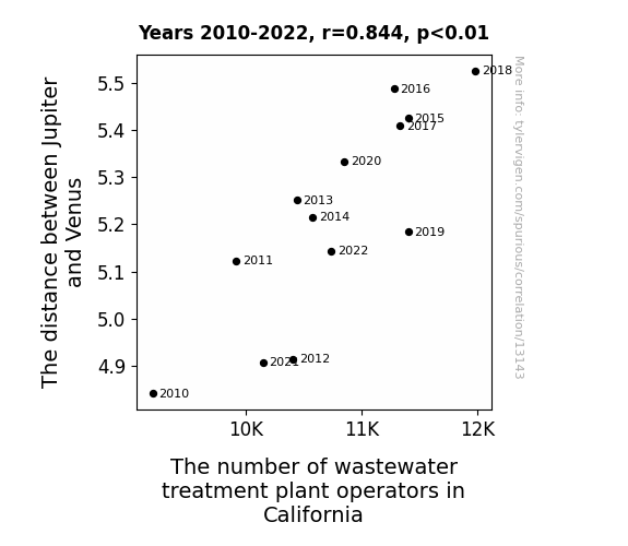 This means 71.2% of the change in the one variable (i.e., The number of wastewater treatment plant operators in California) is predictable based on the change in the other (i.e., The distance between Jupiter and Venus) over the 13 years from 2010 through 2022.