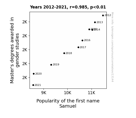 This means 97% of the change in the one variable (i.e., Popularity of the first name Samuel) is predictable based on the change in the other (i.e., Master's degrees awarded in gender studies) over the 10 years from 2012 through 2021.