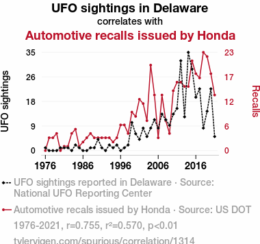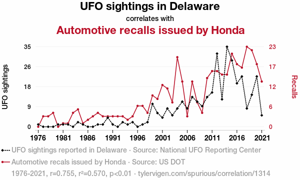 User prompt: Please provide potential search keywords for a paper titled The Cosmic Recall: Unveiling the Interstellar Connection Between UFO Sightings in Delaware and Honda Automotive Recalls with an abstract of This research investigates the intriguing relationship between the obscure world of UFO sightings in Delaware and the earthly realm of Honda automotive recalls. By analyzing data from the National UFO Reporting Center and the US Department of Transportation, we uncovered a surprisingly high correlation coefficient of 0.7551528 and a p-value of less than 0.01 for the time period spanning from 1976 to 2021.