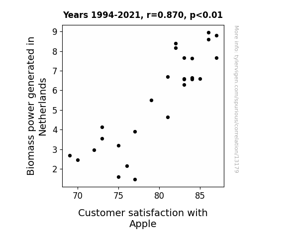 This means 75.7% of the change in the one variable (i.e., Customer satisfaction with Apple) is predictable based on the change in the other (i.e., Biomass power generated in Netherlands) over the 28 years from 1994 through 2021.