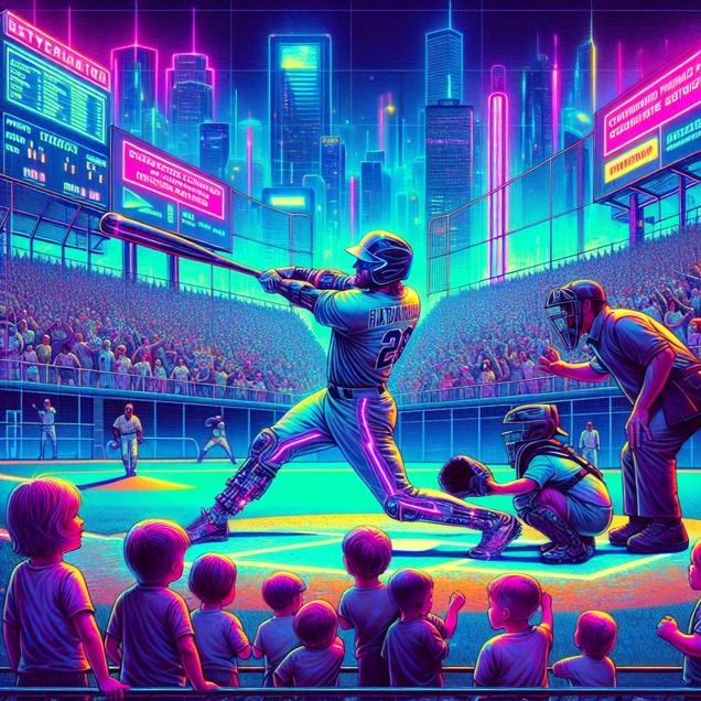 User prompt: Please respond with an image generation prompt that would be likely to create an interesting visual using DALLE-3, using the following style: [ Cyberpunk ] and depicting this scene: Imagine a baseball diamond with Matt Kemp at bat. As he hits fewer home runs, the crowd in Missouri becomes less animated, with fewer fans jumping up and cheering. In a nearby preschool, children seem less engaged, with fewer smiles as they play. The teachers, once bustling around to accommodate the kids, now have a quieter environment with less need for individual attention. Keep the visual depiction simple. Do not include any words or speech bubbles.