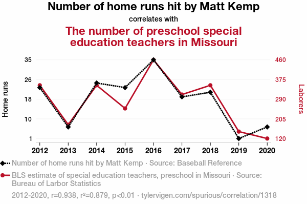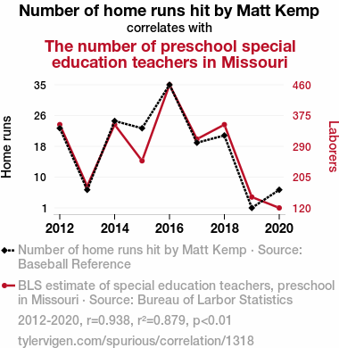 User prompt: Please provide potential search keywords for a paper titled Swinging for the Fences: A Statistical Analysis of the Relationship Between Matt Kemp's Home Runs and Preschool Special Education Teachers in Missouri with an abstract of In this paper, we present the results of our investigation into the curious correlation between the number of home runs hit by professional baseball player Matt Kemp and the number of preschool special education teachers in the state of Missouri. Using data from Baseball Reference and the Bureau of Labor Statistics, we conducted a thorough analysis spanning from 2012 to 2020. Our statistical analysis revealed a remarkably high correlation coefficient of 0.9378156 and p < 0.01, suggesting a strong relationship between these seemingly unrelated variables.