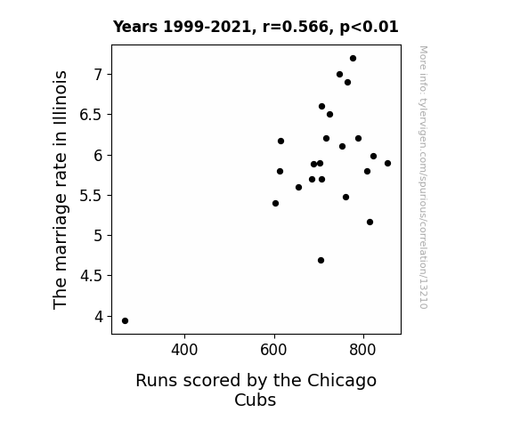 This means 32% of the change in the one variable (i.e., Runs scored by the Chicago Cubs) is predictable based on the change in the other (i.e., The marriage rate in Illinois) over the 23 years from 1999 through 2021.