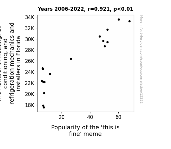 This means 84.7% of the change in the one variable (i.e., Popularity of the 'this is fine' meme) is predictable based on the change in the other (i.e., The number of heating, air conditioning, and refrigeration mechanics and installers in Florida) over the 17 years from 2006 through 2022.