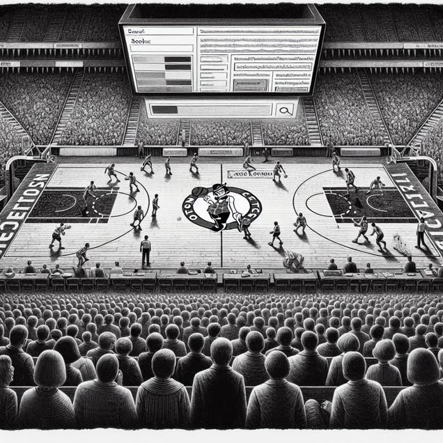 ChatGPT: "Generate a black-and-white newspaper illustration of a basketball court where the Boston Celtics are playing. As the Celtics score fewer points, the crowd starts to disperse. In another part of the scene, a large fading Google search bar appears, with people typing in "please clap" as the crowd dissipates, reflecting the decrease in Google searches for "please clap"."