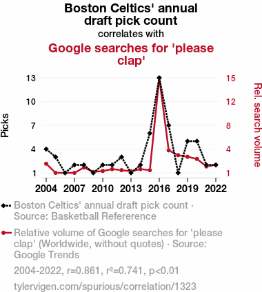 This means 74.1% of the change in the one variable (i.e., Google searches for 'please clap') is predictable based on the change in the other (i.e., Boston Celtics' annual draft pick count) over the 19 years from 2004 through 2022.