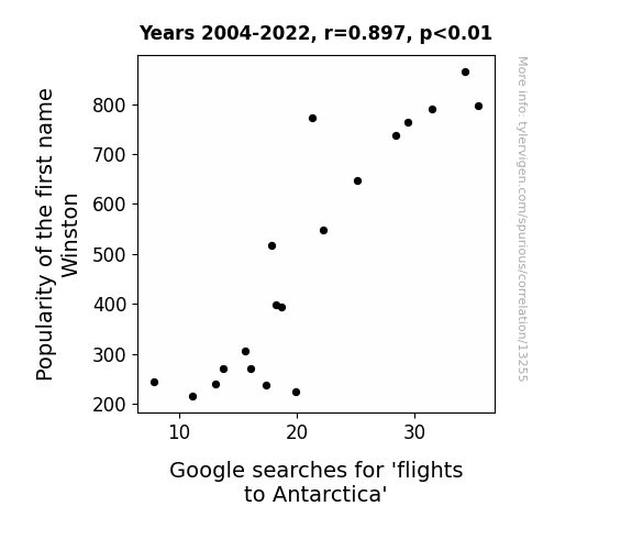 This means 80.4% of the change in the one variable (i.e., Google searches for 'flights to Antarctica') is predictable based on the change in the other (i.e., Popularity of the first name Winston) over the 19 years from 2004 through 2022.
