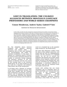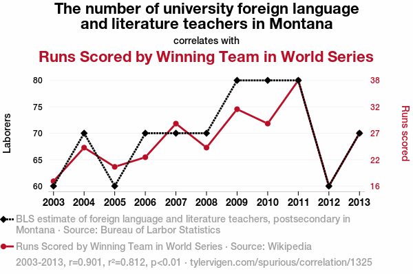 User prompt: Please provide potential search keywords for a paper titled Lost in Translation: The Unlikely Alliances Between Montana's Language Professors and World Series Champions with an abstract of In this study, we delve into the unexpected connection between the number of university foreign language and literature teachers in the state of Montana and the runs scored by the winning team in the World Series. Utilizing data from the Bureau of Labor Statistics and Wikipedia, our research team uncovered a striking correlation coefficient of 0.9012523 and a statistically significant p-value of less than 0.01 for the period spanning from 2003 to 2013. The findings of this study not only shed light on the peculiar relationship between the linguistic academia in Montana and the athletic prowess demonstrated in the global baseball showdown, but also invite further exploration into the mysterious world of seemingly unrelated phenomena. We aim to entertain as well as enlighten, as we unravel this quirky confluence of linguistic expertise and baseball prowess. So grab your baseball mitt and a thesaurus, because this research promises an unexpected journey into the wild world of statistics and language-laden home runs.