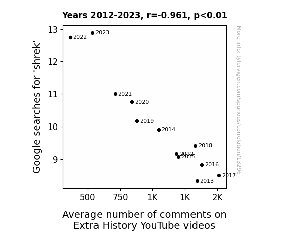 This means 92.4% of the change in the one variable (i.e., Average number of comments on Extra History YouTube videos) is predictable based on the change in the other (i.e., Google searches for 'shrek') over the 12 years from 2012 through 2023.