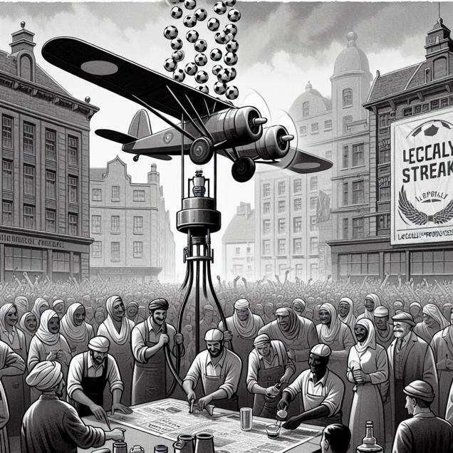 ChatGPT: Generate an image in a style reminiscent of a black-and-white newspaper illustration, depicting a scene in the town square of Caracas. In the center of the image, depict a group of workers carefully refueling a small propeller plane with locally-produced jet fuel. Adjacent to this activity, place a banner proudly displaying the number of wins the Tennessee Titans have achieved in the current football season. The juxtaposition of the fueling activity and the celebratory sports banner should illustrate the two variables in a clear visual manner. Ensure that the image has a simple yet impactful composition, with no words or speech bubbles.