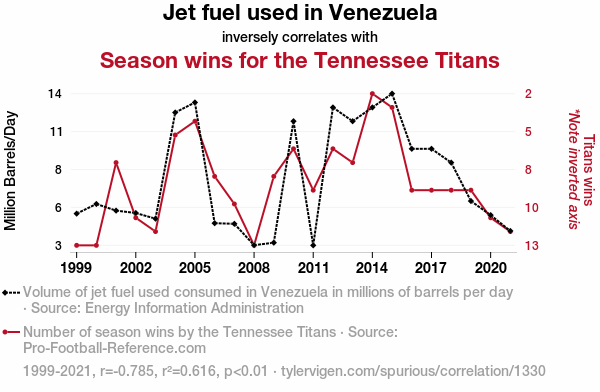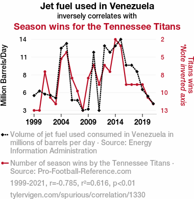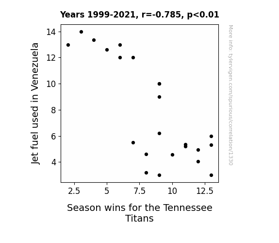 The statistical analysis uncovered a rather striking negative correlation (r = -0.7846700) between jet fuel consumption in Venezuela and the seasonal wins of the Tennessee Titans from 1999 to 2021. This finding suggests that as jet fuel consumption in Venezuela increases, the number of wins for the Tennessee Titans decreases. It's as if the Titans' success is inversely proportional to the fuel consumption in a country rich in oil reserves.