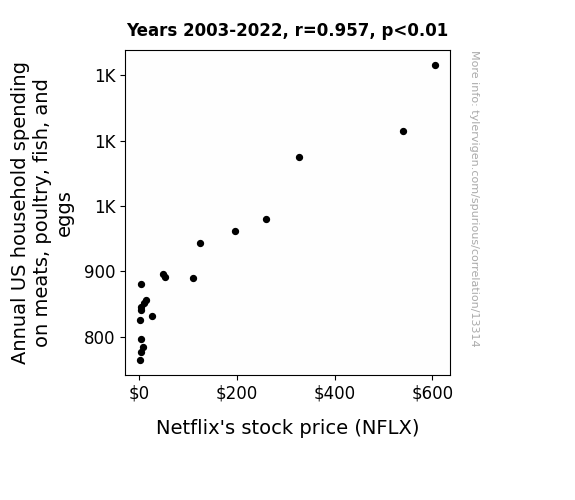 This means 91.5% of the change in the one variable (i.e., Netflix's stock price (NFLX)) is predictable based on the change in the other (i.e., Annual US household spending on meats, poultry, fish, and eggs) over the 20 years from 2003 through 2022.