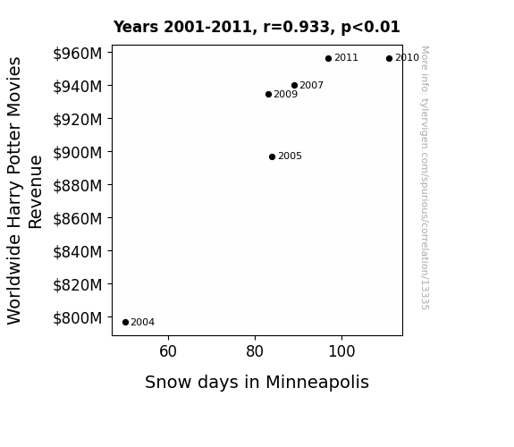 This means 87% of the change in the one variable (i.e., Snow days in Minneapolis) is predictable based on the change in the other (i.e., Worldwide Harry Potter Movies Revenue) over the 6 years from 2001 through 2011.