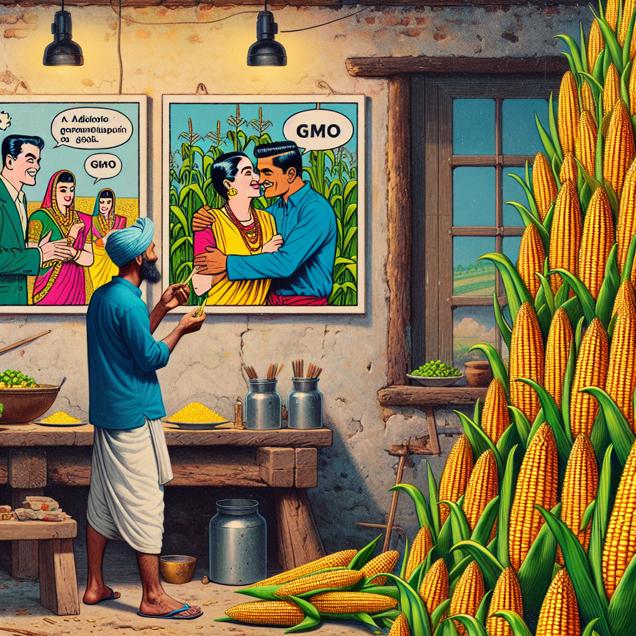 User prompt: Please describe a visual scene that prominently depicts both GMO use in corn and xkcd comics published about romance Keep the description simple.