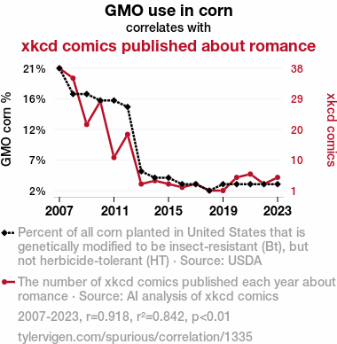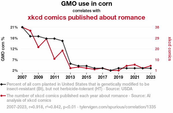 User prompt: Please make up a funny explanation for how a decrease in GMO use in corn caused xkcd comics published about romance to decrease. Make it feel plausible.