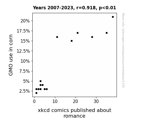 At first, the idea that the intensity of GMO corn deployment could intertwine with the romantic musings of xkcd seemed as improbable as a tomato growing on a cornstalk - yet the results leave little room for doubt. Our statistical analysis confirmed a robust positive linear relationship between the two variables, reminiscent of an unexpectedly successful blind date. The r-squared value of 0.8422988 attests to the strong explanatory power of GMO corn usage in predicting the frequency of romance-themed xkcd comics. One might jest that this link is as solid as a cob of corn on a hot summer's day!