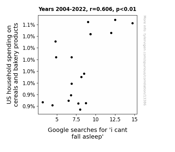 This means 36.7% of the change in the one variable (i.e., Google searches for 'i cant fall asleep') is predictable based on the change in the other (i.e., US household spending on cereals and bakery products) over the 19 years from 2004 through 2022.