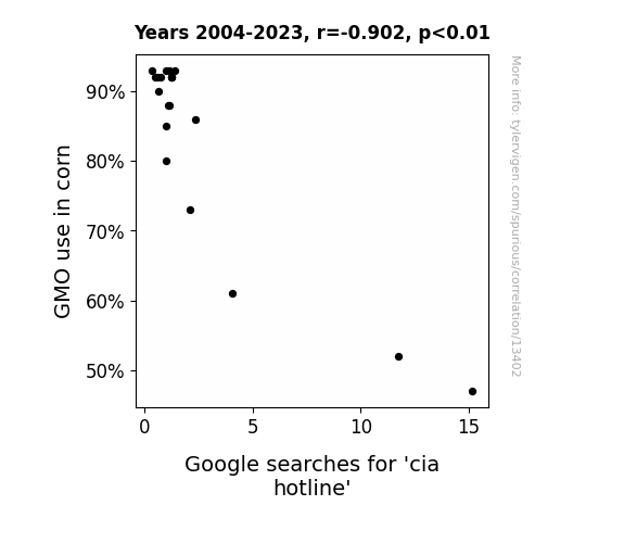 This means 81.4% of the change in the one variable (i.e., Google searches for 'cia hotline') is predictable based on the change in the other (i.e., GMO use in corn) over the 20 years from 2004 through 2023.