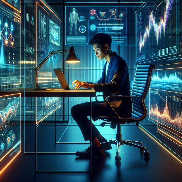 Prompt: Prompt: Produce an image in [ Data cyber art ] style of a young professional in a bustling office, sitting at a desk and typing "who is Elon Musk" into the search bar of their laptop. Meanwhile, a large screen on the wall displays NVIDIA's stock price fluctuating throughout the day. The individual leans back in their chair, analyzing the information on both screens, deep in thought. Emphasize the futuristic setting and digital influence through the use of vibrant neon colors, glowing data visualizations, and sleek, modern technology. The depiction should include only scenes, people, and objects, it should not include text or speech bubbles.