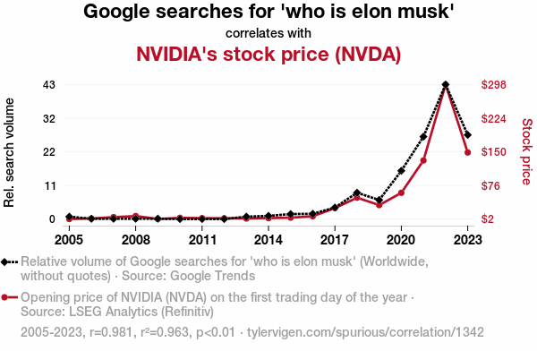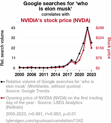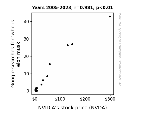 - The spurious research paper: Musk-Googlity: Exploring the Correlation between Google Searches for 'Who is Elon Musk' and NVIDIA's Stock Price