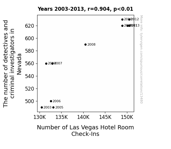 This means 81.7% of the change in the one variable (i.e., Number of Las Vegas Hotel Room Check-Ins) is predictable based on the change in the other (i.e., The number of detectives and criminal investigators in Nevada) over the 11 years from 2003 through 2013.
