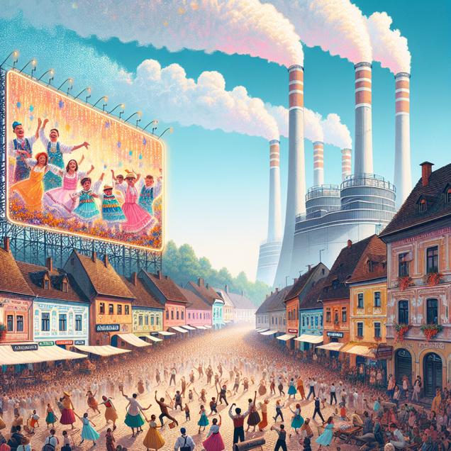 Prompt: [ Whimsical illustration ] In a lively Romanian town square, a whimsical billboard adorned with vibrant, colorful letters proudly spells "Nora." The bustling square is filled with cheerful people wandering about, and there is a sense of joy and festivity in the air. Towering above the scene, a massive biomass power plant proudly stands, with clean, billowing white steam rising from its tall chimneys into the sky. The contrast between the bustling town square and the imposing yet environmentally-friendly power plant creates an intriguing juxtaposition, capturing the spirit of renewal and vitality. The depiction should include only scenes, people, and objects, it should not include text or speech bubbles.