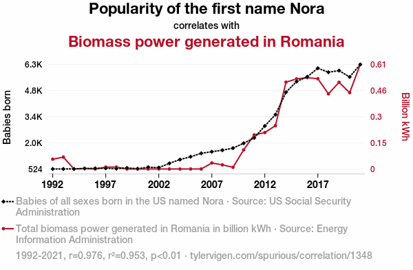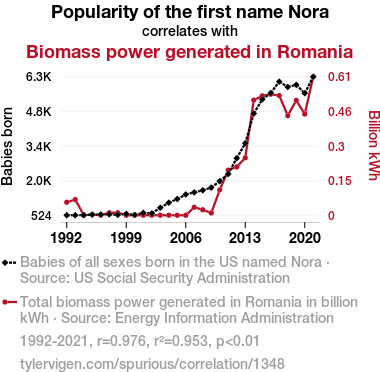 - The spurious research paper: Name-Dropping Nora: Exploring the Correlation between Nora's Popularity and Biomass Power Generation in Romania