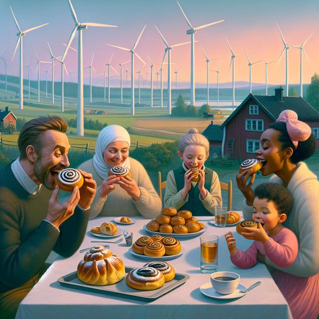 Prompt: Prompt: In a Swedish countryside, a small group of people are depicted savoring fresh pastries, while in the background, a row of towering wind turbines harness the power of the wind. The scene encapsulates the contrast between indulgence and sustainable energy. The colors should reflect the serene beauty of the countryside, with a touch of magic to emphasize the harmony between human enjoyment and nature's power. The depiction should include only scenes, people, and objects, it should not include text or speech bubbles.