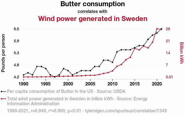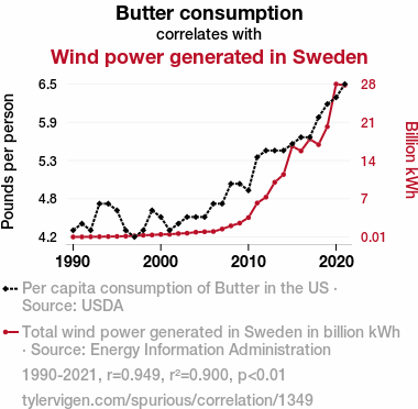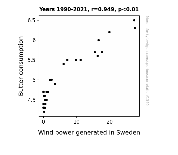 This means 90% of the change in the one variable (i.e., Wind power generated in Sweden) is predictable based on the change in the other (i.e., Butter consumption) over the 32 years from 1990 through 2021.