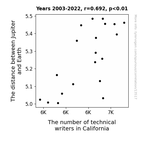 This means 47.9% of the change in the one variable (i.e., The number of technical writers in California) is predictable based on the change in the other (i.e., The distance between Jupiter and Earth) over the 20 years from 2003 through 2022.