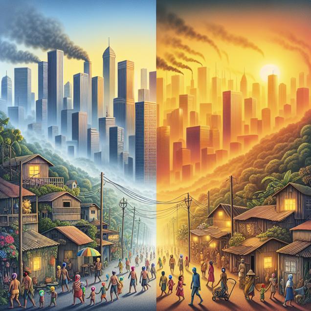 ChatGPT: [ Whimsical illustration ] In a bustling city, thick smog hangs in the air, blurring the towering buildings into dreamy silhouettes. People adorned in colorful masks traverse the streets, each figure a whimsical display of resilience against the polluted skies. Meanwhile, in a tranquil Brazilian village, families gather under the soft glow of kerosene lamps as the sun slips below the horizon. The warm light bathes the quaint dwellings and the surrounding foliage with a magical, cozy aura.