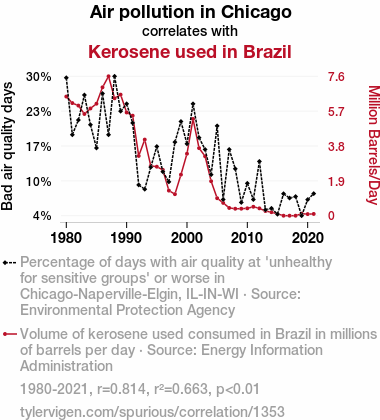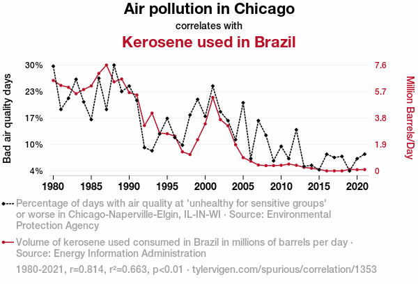 A linear line chart with years as the X-axis and two variables on the Y-axis. The first variable is Air pollution in Chicago and the second variable is Kerosene used in Brazil.  The chart goes from 1980 to 2021, and the two variables track closely in value over that time. Small Image