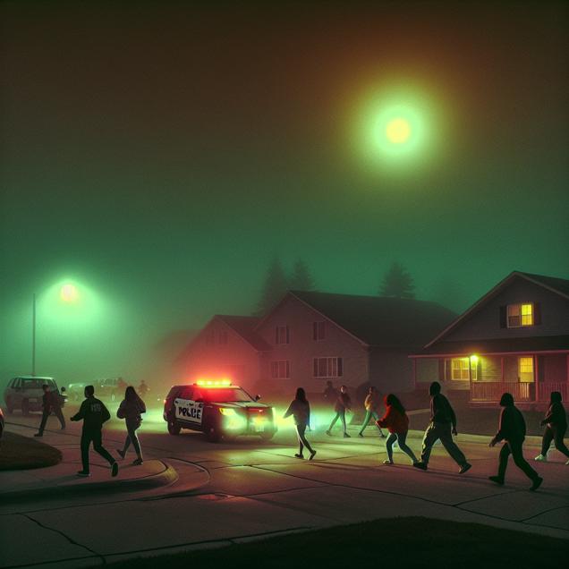 Prompt: Create an image of a hazy sky looming over Green Bay, Wisconsin, where people hustle past a row of houses. In the background, capture the flashing lights of a police car as officers are engaged in an investigation. The scene should convey a sense of mystery and tension, with the hazy sky and hurried movement of people adding to the ambiance of uncertainty. The depiction should include only scenes, people, and objects, it should not include text or speech bubbles.