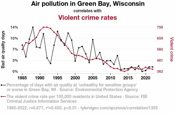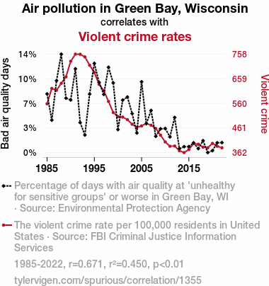This means 45% of the change in the one variable (i.e., Violent crime rates) is predictable based on the change in the other (i.e., Air pollution in Green Bay, Wisconsin) over the 38 years from 1985 through 2022.