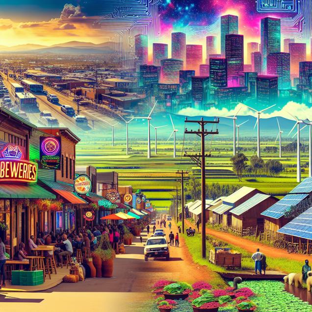 ChatGPT: Create an image that blends the energy of a bustling city street in the United States with the tranquil countryside of Burundi. Show vibrant breweries with unique signs and outdoor seating areas lining the city street, each exuding a distinct cyber art style. Meanwhile, the serene landscape of Burundi is adorned with solar panels and wind turbines, harnessing renewable energy sources to power the surrounding homes and communities. Capture the dynamic contrast between the urban and rural settings, combining the energy of city life with the sustainable harmony of rural living.