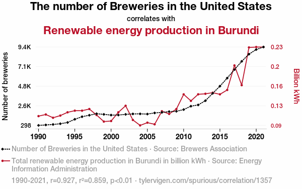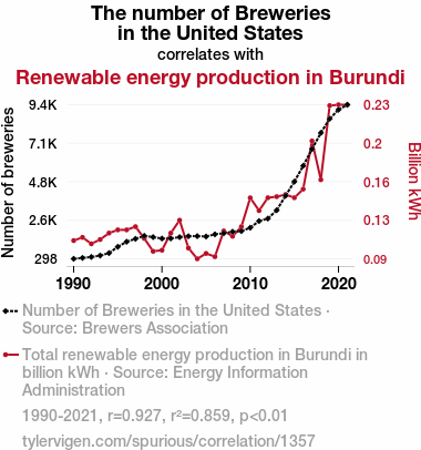 - The spurious research paper: Brewing Up a Spark: Exploring the Sudsy Link Between Brewery Numbers in the United States and Renewable Energy Production in Burundi