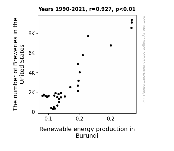 This means 85.9% of the change in the one variable (i.e., Renewable energy production in Burundi) is predictable based on the change in the other (i.e., The number of Breweries in the United States) over the 32 years from 1990 through 2021.
