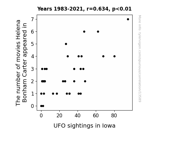 This means 40.1% of the change in the one variable (i.e., UFO sightings in Iowa) is predictable based on the change in the other (i.e., The number of movies Helena Bonham Carter appeared in) over the 39 years from 1983 through 2021.