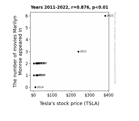 This means 76.8% of the change in the one variable (i.e., Tesla's stock price (TSLA)) is predictable based on the change in the other (i.e., The number of movies Marilyn Monroe appeared in) over the 12 years from 2011 through 2022.