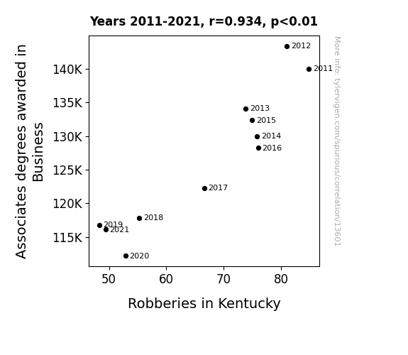 This means 87.3% of the change in the one variable (i.e., Robberies in Kentucky) is predictable based on the change in the other (i.e., Associates degrees awarded in Business) over the 11 years from 2011 through 2021.
