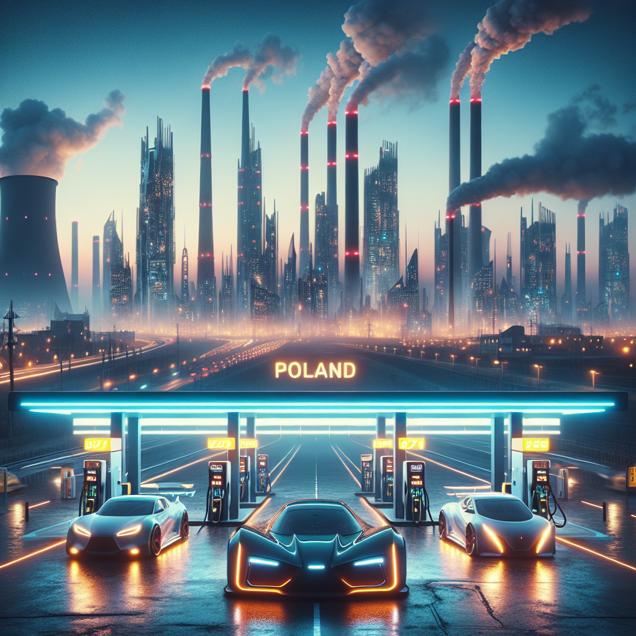 ChatGPT: Generate an image showing a cyberpunk cityscape at dusk, with towering industrial chimneys emitting plumes of smoke in the background. In the foreground, depict a futuristic petrol station in Poland, with sleek vehicles lined up, each emitting a neon glow amidst the scent of gasoline. The setting should convey a contrast between the dystopian atmosphere of Morgan City, Louisiana, and the high-tech, bustling activity of the Polish petrol station.