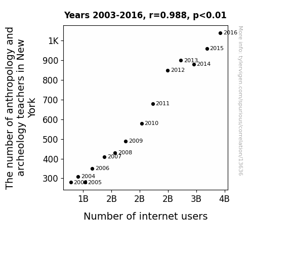 This means 97.7% of the change in the one variable (i.e., Number of internet users) is predictable based on the change in the other (i.e., The number of anthropology and archeology teachers in New York) over the 14 years from 2003 through 2016.
