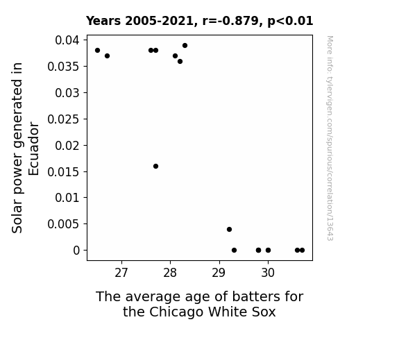 This means 77.3% of the change in the one variable (i.e., The average age of batters for the Chicago White Sox) is predictable based on the change in the other (i.e., Solar power generated in Ecuador) over the 17 years from 2005 through 2021.