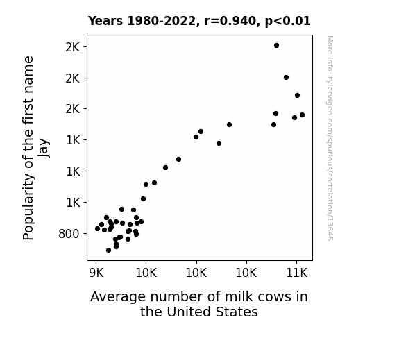 This means 88.3% of the change in the one variable (i.e., Average number of milk cows in the United States) is predictable based on the change in the other (i.e., Popularity of the first name Jay) over the 43 years from 1980 through 2022.