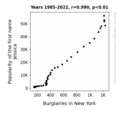 This means 98.1% of the change in the one variable (i.e., Burglaries in New York) is predictable based on the change in the other (i.e., Popularity of the first name Jessica) over the 38 years from 1985 through 2022.