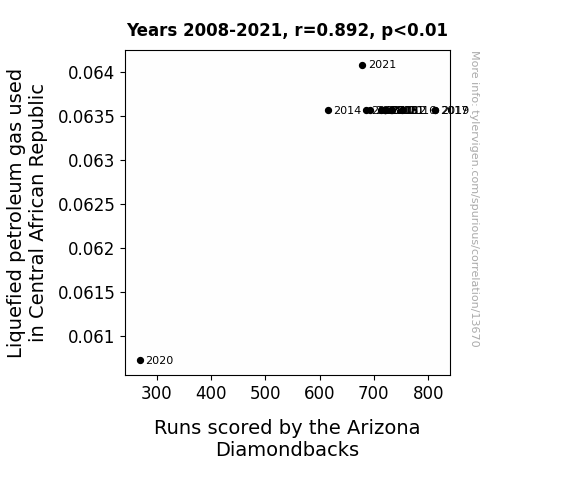 This means 79.5% of the change in the one variable (i.e., Runs scored by the Arizona Diamondbacks) is predictable based on the change in the other (i.e., Liquefied petroleum gas used in Central African Republic) over the 14 years from 2008 through 2021.