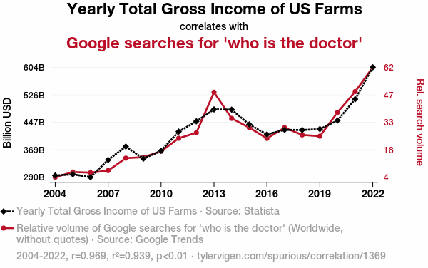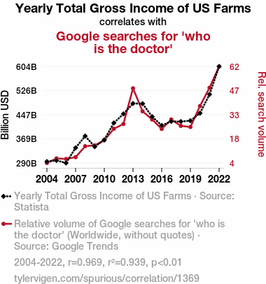 - The spurious research paper: The Doctor is In...Demand: Exploring the Correlation Between Yearly Total Gross Income of US Farms and Searches for 'Who is the Doctor' on Google
