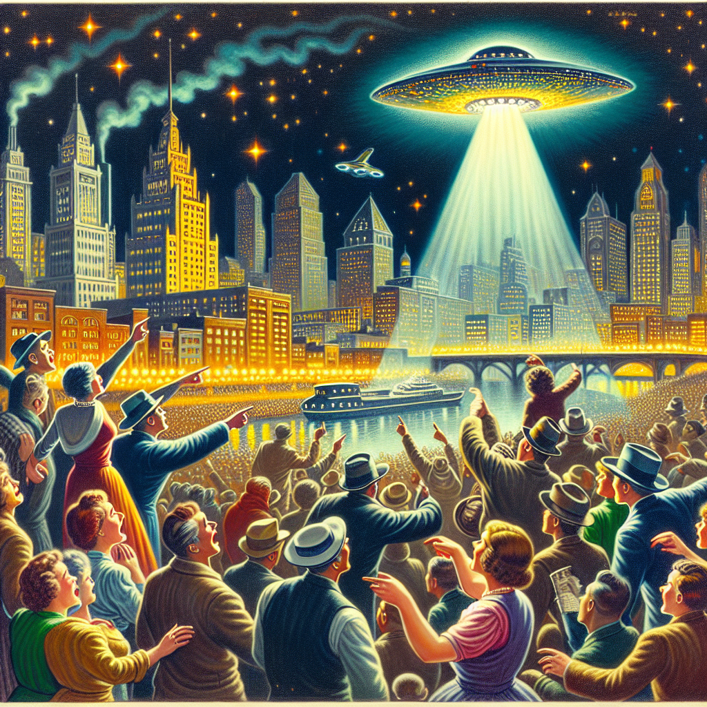Prompt: Generate a vibrant pop art-style visual of a bustling Ohio city at night, filled with a diverse crowd of people pointing excitedly at a glowing UFO hovering over the skyline. The UFO and the city lights should be depicted with bright, contrasting colors, capturing the energy and excitement of the scene. Highlight the diversity of the population through the variety of building styles and the mix of people in the crowd. Emphasize the sense of wonder and amazement as the citizens witness this otherworldly event. The depiction should include only scenes, people, and objects, it should not include text or speech bubbles.