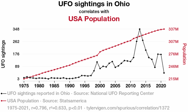 A linear line chart with years as the X-axis and two variables on the Y-axis. The first variable is UFO sightings in Ohio and the second variable is USA Population.  The chart goes from 1975 to 2021, and the two variables track closely in value over that time. Small Image